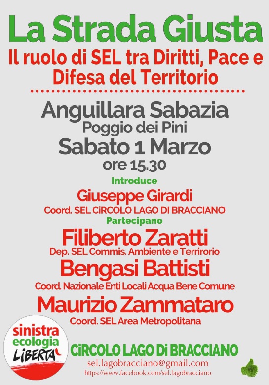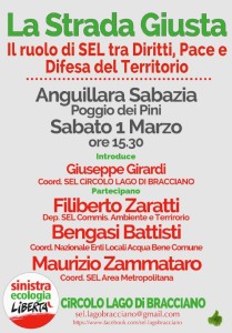 Si tiene sabato primo marzo alle ore 15.30 presso l’Hotel Poggio dei Pini di Anguillara Sabazia l’assemblea pubblica indetta dal circolo Lago di Bracciano di Sinistra Ecologia e Libertà dal titolo “La strada giusta. Il ruolo di SEL tra Diritti, Pace e Difesa del Territorio”.