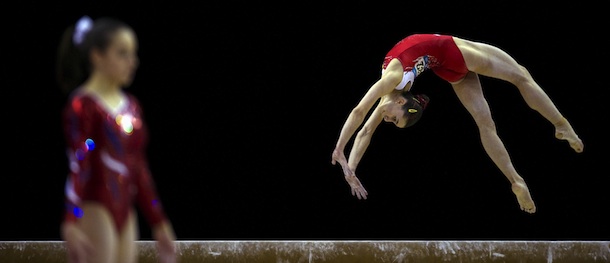 Beatriz Cuesta (R) of Spain performs on the beam during the women’s qualification of the Artistic International Gymnastics London 2012 Olympic qualifier, a part of the London Prepares series of test events, at the North Greenwich Arena in London on January 11, 2012. AFP PHOTO / ADRIAN DENNIS (Photo credit should read ADRIAN DENNIS/AFP/Getty Images)
