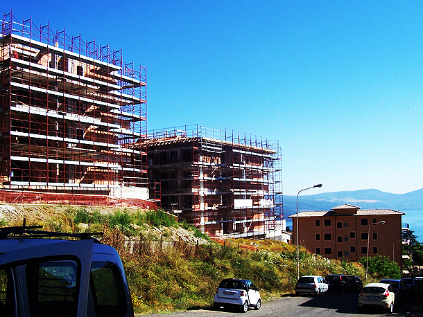 “Il processo prende il nome dall’area pubblica, il ‘prato-giardino’ – scrive l’associazione Salviamo Bracciano in un comunicato stampa – con giochi per bambini, garantita dal piano regolatore, e situata in uno dei rari belvedere sul lago, ora sostituito da una lottizzazione di tre mastodontici palazzi rosa salmone, ricoperta di asfalto, privata del gran numero di querce e altri alberi secolari preesistenti. Il panorama copre anche la vista del celebre castello. I palazzi contestati risulterebbero inoltre oggetto di abusi edilizi mirati ad ampliarne la volumetria già di per sé eccessiva, dato il luogo. Le conseguenze stanno provocando gravi ripercussioni idrogeologiche nell’area sottostante (smottamenti, allagamenti, pericolo per l’incolumità di persone e mezzi sulla viabilità). Il complesso residenziale insiste anche sul cimitero, senza rispettarne le distanze”.