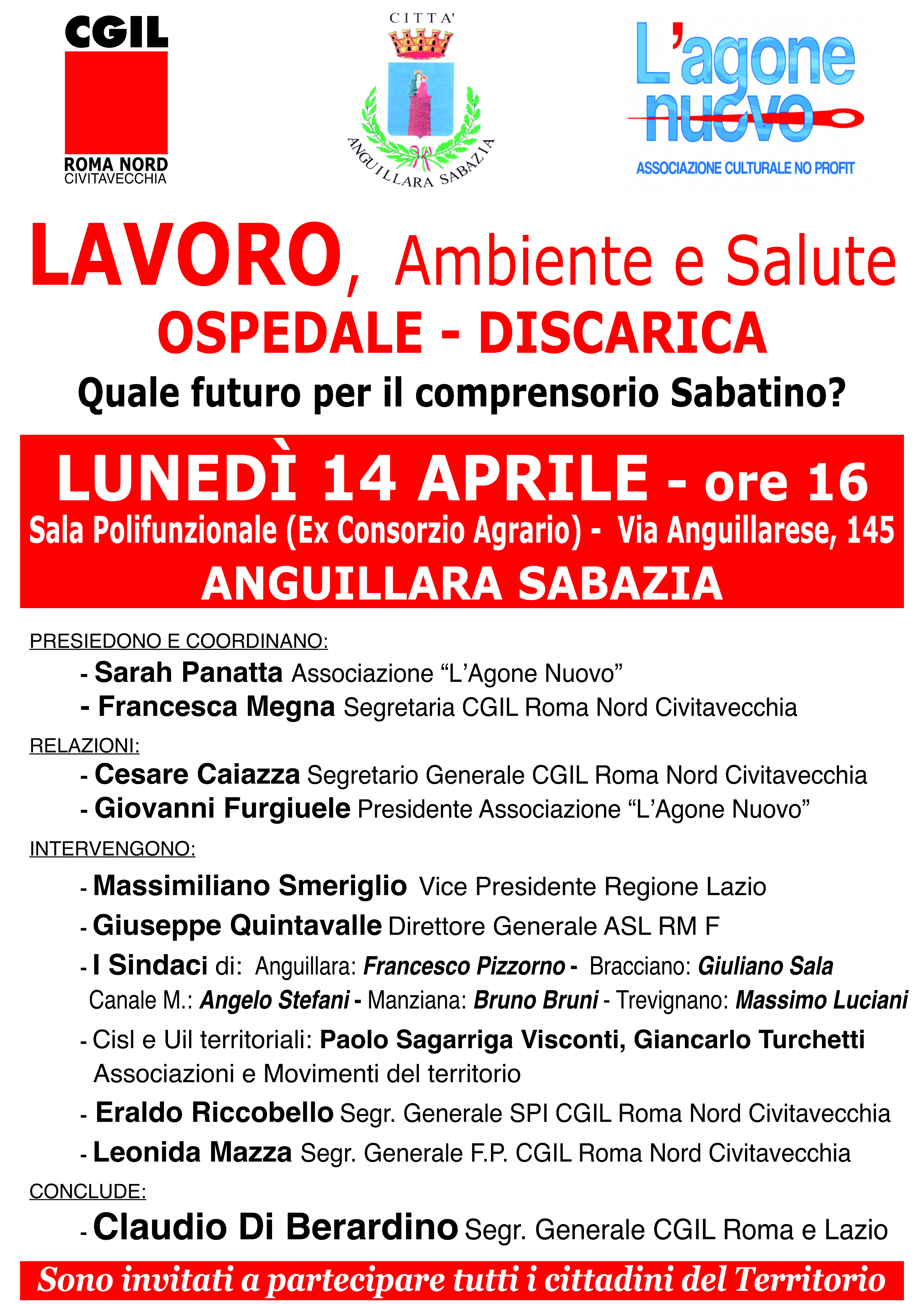 “Lavoro, Ambiente e Salute: Ospedale – Discarica” – Quale futuro per il comprensorio sabatino? E’ il titolo del convegno promosso dall’associazione culturale L’agone nuovo, in collaborazione con la Cgil Roma Nord e il Comune di Anguillara, in programma lunedi 14 Aprile 2014 alle ore 16 presso la Sala Polifunzionale (Ex Consorzio Agrario) in Via Anguillarese 145 ad Anguillara Sabazia.