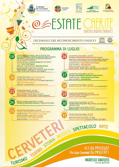 Ogni giorno, dal 19 luglio al 31 agosto, eventi a Cerveteri e nelle Frazioni. Partita sabato, con una ricca serata nel cuore del Centro Storico. Poi il cabaret di Marco Marzocca, una rassegna in onore di Giuliano Gemma, un concerto dedicato a Mia Martini e il concerto del Gruppo Bandistico Caerite. Ad agosto, We Love Pizza, Etruria Eco Festival e Sagra dell’Uva e del Vino.