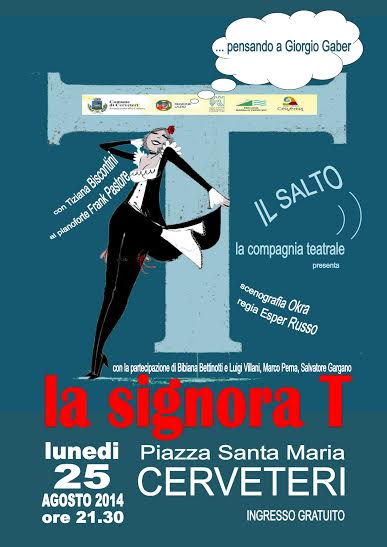 Terminata con il concerto gratuito di Arisa l’ottava edizione dell’Etruria Eco Festival, dopo l’evento tenutosi al Parco della Legnara, gli eventi dell’Estate Caerite 2014 tornano nella cornice di Piazza di Santa Maria. Questa sera alle ore 21.30 andrà in scena “La Signora T”: una serata interamente dedicata a Giorgio Gaber per la regia di Tiziana Biscontini ed Esper Russo della Compagnia Teatrale “Il Salto”. L’ingresso è gratuito.