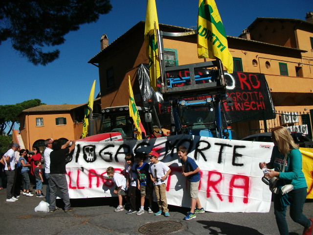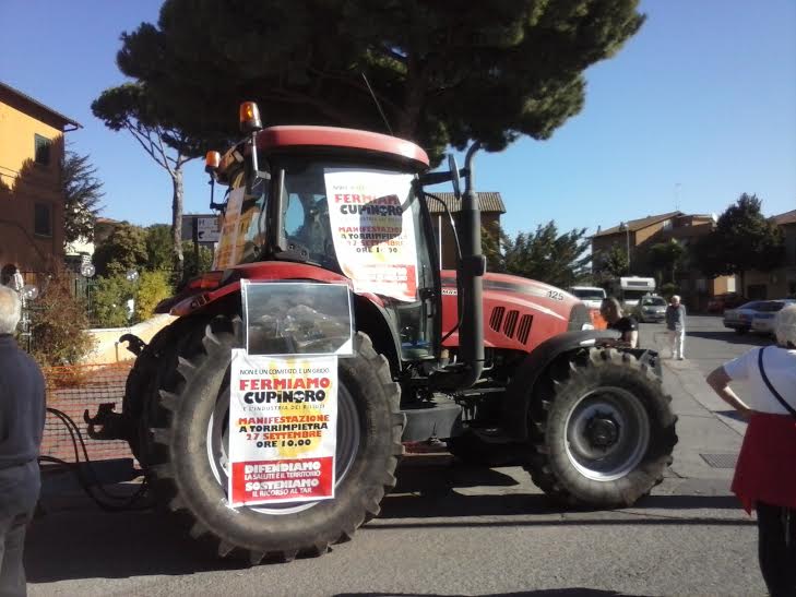 La questura non ha autorizzato un corteo per le strade della cittadina, quindi i manifestanti, guidati dai comitati “Stop Discarica” e “Terra Attiva”, hanno attraversato ripetutamente la strada, in un ordinato chiassoso flusso. Un palco e molti interventi. Tra i trattori fermi, appoggi simbolici per gli striscioni della giornata, icone e sintomi di un’economia dell’agricoltura e del turismo, minacciata se non affossata dalla presenza venetannale di una discarica che insiste su un’area archeologica sottoposta a numerosi e non rispettati vincoli e riconosciuta patrimonio dell’Unesco, danneggiando la vocazione e l’equilibrio di un intero territorio. Una manifestazione per riunire tutte le istanze, abbandonando particolarismi e battaglie private. Una lotta in campo aperto, di tutta la comunità per seppellire il mostro-discarica e riconsiderare le politiche energetiche del territorio. Tutti i partecipanti che si sono alternati brevemente sul palco per rivendicare la natura della manifestazione, hanno sottolineato come informarsi e condividere nozioni e idee sia il primo passo per difendersi difendendo il proprio ambiente. Se Cupinoro significa inquinamento, allarme salute, devastazione per i produttori locali, bacino di irregolarità non ancora emerse e possibile futuro di TMB e biodigestori, le azioni immediatamente necessarie sono due, hanno rimarcato tutti. Da un lato formare una rete che non si sfaldi per beghe interne, che sappia mantenere un obiettivo unico e solidale, una ribellione pacifica e documentata, continua e osmotica. Dall’altro smagare lobbie politiche, camorre reali e mafie mentali, impedire che un illecito come la discarica diventi tumore invincibile per il territorio. Ridare vita allo spirito critico vitale della poplazione, che assopita dal duro tran tran quotidiano, non vede la pesante trave che pur fende l’occhio, e non solo.