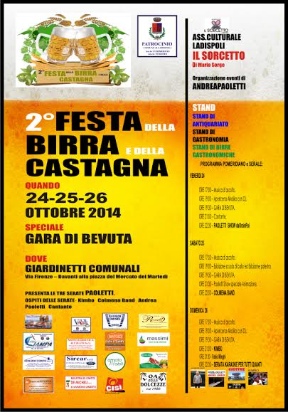 L’amministrazione comunale informa che prossimo fine settimana, dal 24 al 26 ottobre, a Ladispoli si svolgerà la seconda edizione della Festa della birra e della castagna. Lo spazio verde di via Firenze ospiterà giochi, degustazioni e musica. Le castagne, provenienti dai Monti Cimini, potranno essere degustate in vari modi, ad allietare i visitatori ci saranno eventi musicali, ludici e culturali. Promotrice dell’evento, patrocinato dal Comune, è l’associazione Il Sorcetto che da tempo organizza fiere e mercatini a Ladispoli.