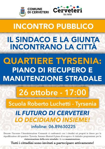 Nell’ambito del progetto di partecipazione diretta ‘Cerveteri in Rete’, l’Amministrazione comunale organizza un nuovo incontro pubblico con i cittadini del Tyrsenia. L’appuntamento è fissato per domenica 26 ottobre alle ore 17.00 presso la scuola materna Roberto Luchetti di Via Chirieletti, nel quale si continuerà il dialogo già avviato a giugno sul tema del Piano di Recupero e della manutenzione stradale del Quartiere Tyrsenia.