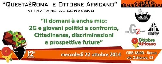 Il giorno 22 ottobre si terrà la conferenza “Il domani è anche mio: seconde generazioni e giovani politici a confronto. Cittadinanza, discriminazioni e prospettive future”, all’interno della 12° edizione del Festival “Ottobre Africano”, alle ore 18 presso il Caffè Letterario di Roma in Via Ostiense 95.