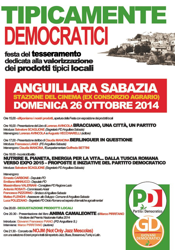 “Nutrire il pianeta, energia per la vita……” è l’argomento del dibattito che ci sarà alla festa del tesseramento organizzata dal Partito Democratico di Anguillara per la prossima domenica, 26 ottobre. Il richiamo all’Expo 2015 è esplicito e intende focalizzare l’attenzione sulla reciproca influenza che i fenomeni planetari hanno su quelli locali. La festa comunque non sarà solo “dibattito” ma ci sarà anche la presentazione di tre libri, due legati alle origini del PD ed uno di poesie, giusta introduzione al concerto finale.