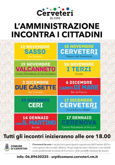 “Partecipare agli incontri è importante per chi vuole approfondire i temi che riguardano il proprio territorio di residenza e, più in generale i temi importanti e i progetti che riguardano Cerveteri – ha dichiarato il Sindaco Alessio Pascucci – durante l’incontro di mercoledì avremo modo di illustrare ai cittadini il lavoro svolto fino ad ora dalla Giunta comunale, gli investimenti fatti, o progetti in piedi e anche tutte le problematiche che necessitano di ulteriori approfondimenti o che devono essere affrontate sentendo anche il parere dei cittadini. Gli incontri, di volta in volta, riguardano sia tematiche locali che tematiche generali, quindi tutti sono invitati a partecipare, anche le realtà associative e i comitati civici attivi sul territorio”.
