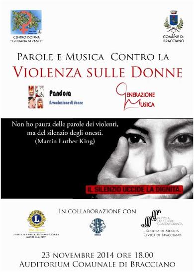 “Il silenzio uccide la dignità” è l’appello denuncia che caratterizza lo spettacolo in programma domenica 23 novembre alle 18 all’auditorium comunale. “Parole e musica contro la violenza sulle donne” propone brani musicali alternati a interpretazioni di brani poetico-letterari. Un evento “collettivo” frutto della sinergia creativa delle associazioni Generazione Musica, Pandora onlus, Lions Club Bracciano-Anguillara-Monti Sabatini, Giovani Leo, Piccola Orchestra Contemporanea. Vari gli interpreti in una alternanza di generi e di stili, da Rita Pensa con un brano da “L’atro figlio” di Luigi Pirandello a Benedetta Rustici con un brano dall’“Antigone” di Sofocle, dai versi di Amelia Rosselli letti da Andrei Pollari a quelli di Maria Grazia Gambarino, fino alla lettera della condannata a morte Reyhaneh Jabbari giustiziata a Teheran il 25 ottobre 2014 letta da Flavia Flamini. Il tutto inframmezzato da motivi musicali eseguiti dall’ensemble della Piccola Orchestra Contemporanea.