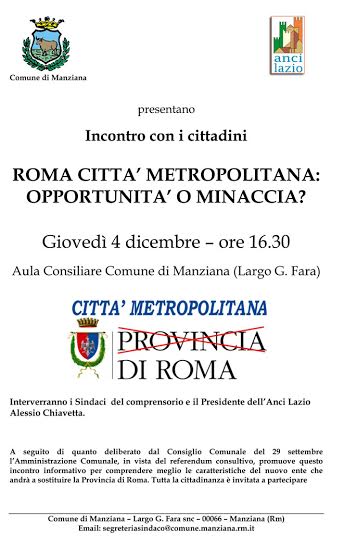 unnamedGiovedì 4 dicembre alle 16:30 presso l’aula consiliare del Comune di Manziana (Largo G.Fara) l’Amministrazione Comunale di Manziana in collaborazione con Anci Lazio, promuove un incontro per comprendere al meglio le caratteristiche e le competenze