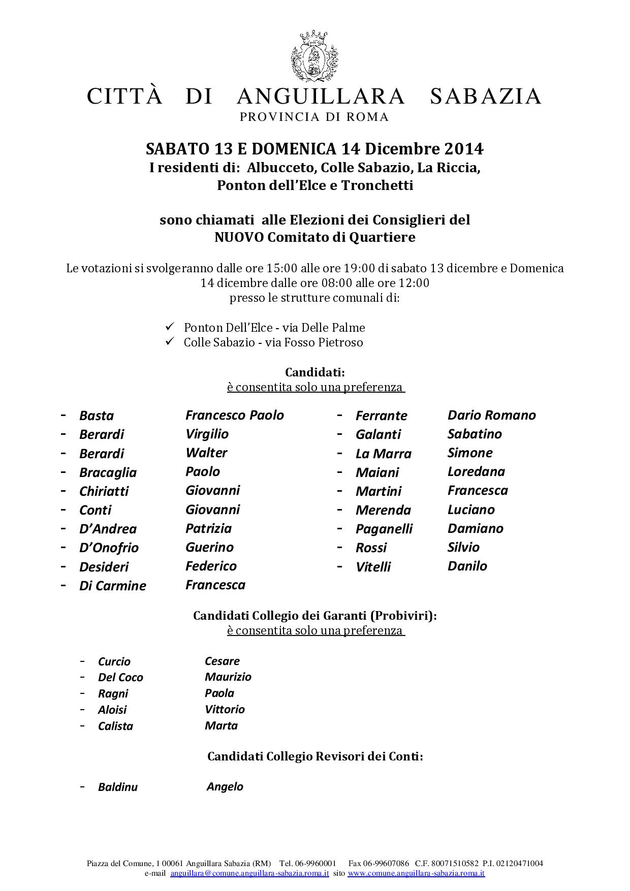 Dopo un iter burocratico durato 9 anni, che a visto impegnati tecnici amministratori e cittadini, con l’approvazione all’unanimita del regolamento dei comitati di quartieri da parte del Consiglio Comunale e la ratifica del numero dei quartieri da parte della commissione tecnica, è stato avviato il processo per la realizzazione di questo importante progetto di democrazia partecipata, chi si concretizza con le prime elezioni che si svolgeranno il 13 e 14 dicembre 2014 nel quartiere n. 9 di Ponton Dell’Elce Colle Sabazio.