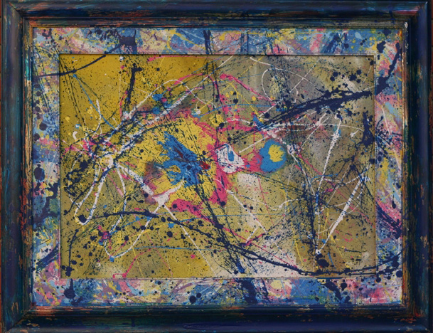 L’ altro quadro risale all’anno 2006 dal titolo ‘’Sospensione 2’’ eseguito con tecnica mista in action painting, dove la stesura del colore, apparentemente casuale, e invadendo anche la cornice rende il tutto coinvolgente ed esplosivo.