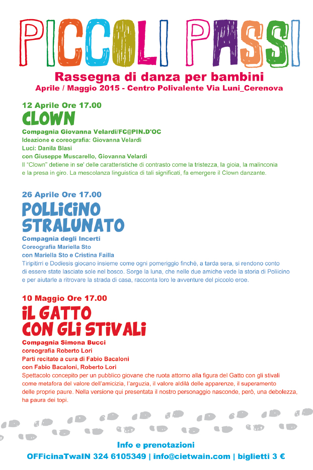 I successivi spettacoli, ‘Pollicino stralunato’ e ‘Il Gatto con gli Stivali’ andranno in scena domenica 26 aprile e domenica 10 maggio, sempre alle ore 17.00, sempre al Centro Polivalente di Via Luni.