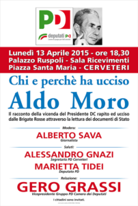 Proprio l’On. Grassi sarà a Cerveteri LUNEDI’ 13 APRILE alle 18:30 presso Palazzo Ruspoli, Sala Ricevimenti in Piazza Santa Maria per l’iniziativa ‘Chi e perché ha ucciso Aldo Moro – Il racconto della vicenda del presidente DC rapito ed ucciso dalle Brigate Rosse attraverso la lettura dei documenti di Stato’