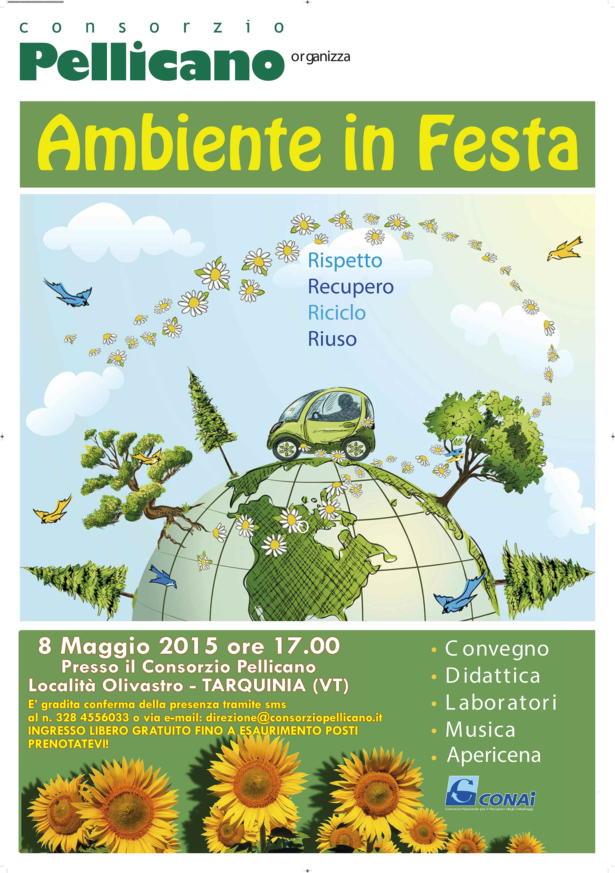 Ambiente in Festa, un Pomeriggio/Evento il cui protagonista è l’AMBIENTE. Ambiente in Festa animerà la sede del Consorzio Pellicano in iniziative varie e significative quali un Convegno su tematiche legate alla tutela dell’ambiente per una migliore qualità di vita in cui interverranno amministratori e esperti in materia; la Didattica finalizzata alla conoscenza del “Riciclo”; il Laboratorio di riciclo creativo per coinvolgere i bambini e gli adulti per creare oggetti realizzati con materiali di recupero; l’Arte del riciclo dei materiali rappresentata da un artista che creerà una installazione Artistica ad hoc nel nostro Impianto e per finire…Musica dal Vivo e Apericena.
