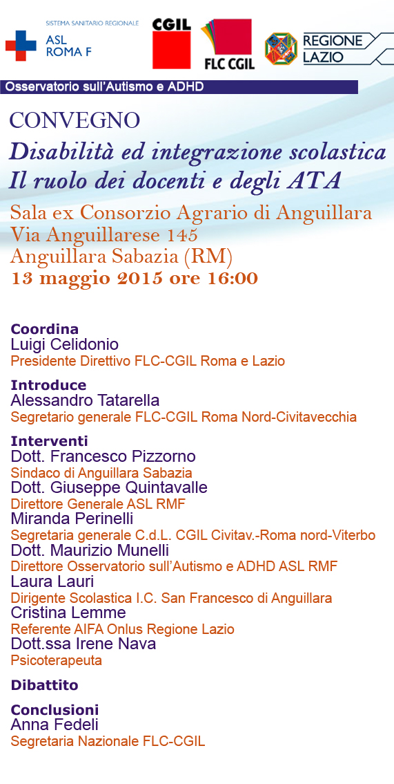 Il 13 Maggio alle ore 16.00 presso l’Ex Consorzio Agrario di Anguillara Sabazia un convegno sulla “Disabilità e integrazione scolastica, il ruolo dei docenti e degli ATA”.