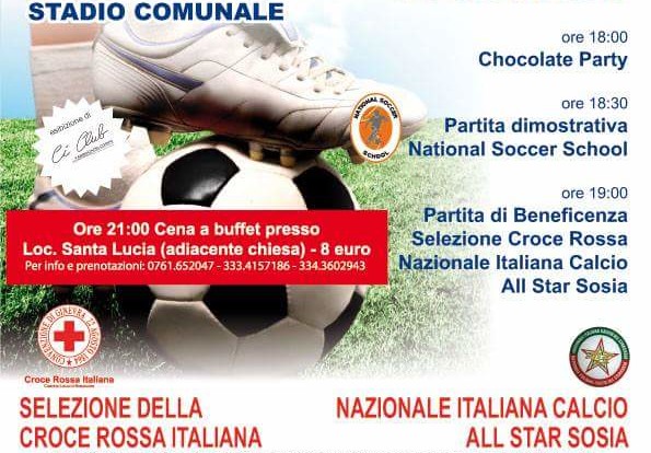 La partita si svolgerà presso lo Stadio Comunale di Ronciglione e vedrà coinvolte la Selezione Croce Rossa, da una parte, e la Nazionale Italiana Calcio All Star Sosia, dalla altra. Nelle fila di quest’ultima, i sosia più famosi del Bel Paese, tra cui Totti, Di Canio, George Michael (impersonato dal Presidente Massimo Nardi), Richard Gere e molti altri.