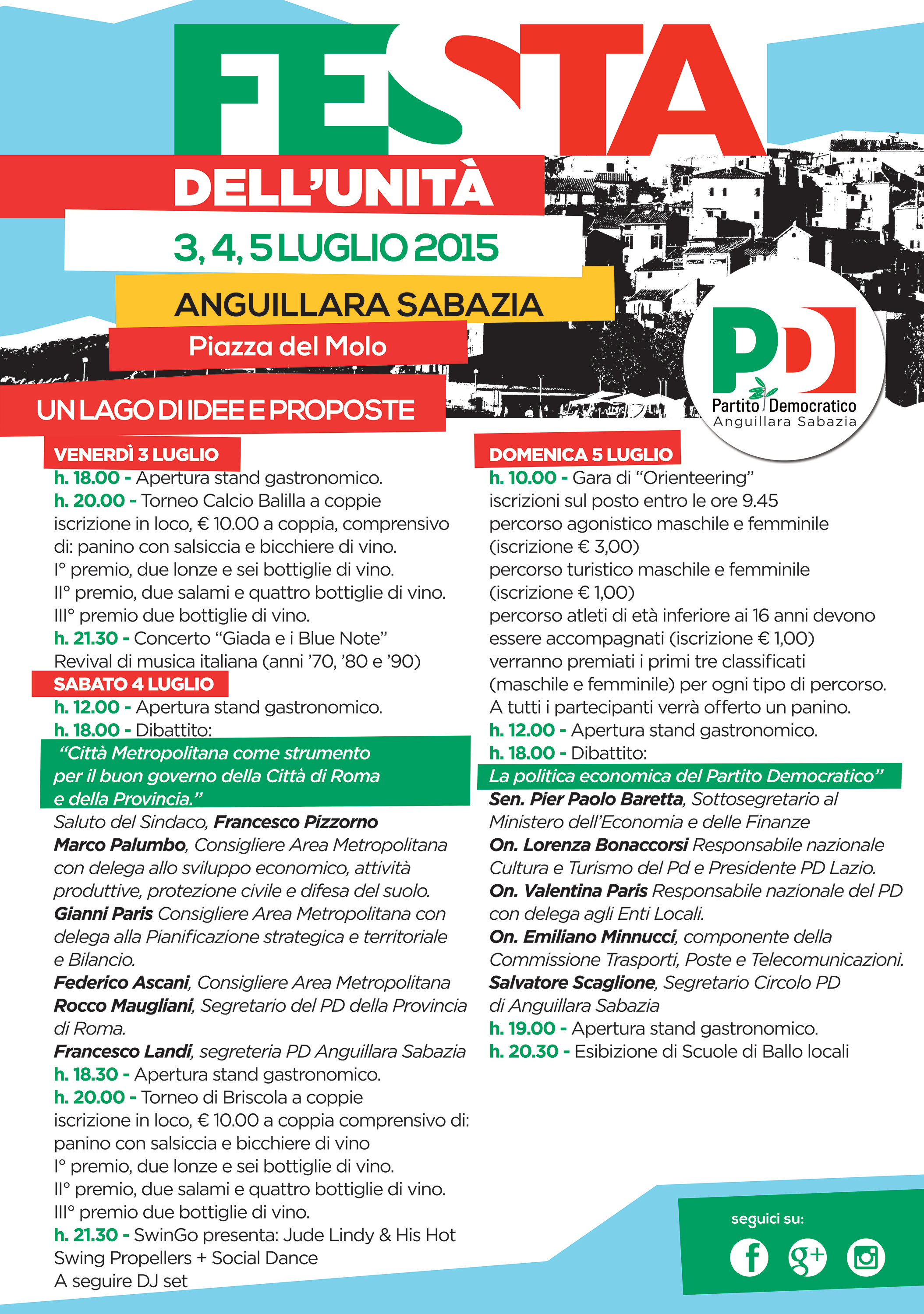 Quasi in sintonia con il ritorno in edicola, e online, della rivista l’Unità, Anguillara e il Circolo PD invitano dal 3 al 5 Luglio a prendere parte all’evento, con un programma e ospiti di tutto rispetto, come Marco Palumbo, Gianni Paris, Federico Ascani, Consiglieri Area Metropolitana, Rocco Maugliani, Segretario PD della provincia di Roma, Sen. Pier Paolo Baretta, l’On. Lorenza Bonaccorsi, l’On. Valentina Paris e l’On. Emiliano Minnucci.