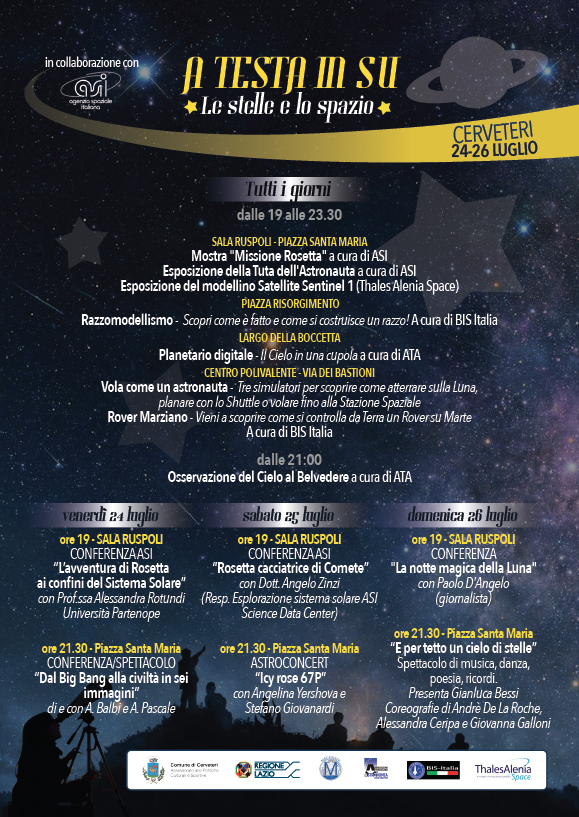 Mercoledì 22 luglio alle ore 11.30 il Comune di Cerveteri e l’Agenzia Spaziale Italiana terranno una conferenza stampa di presentazione della manifestazione “A TESTA IN SU – LE STELLE E LO SPAZIO”.