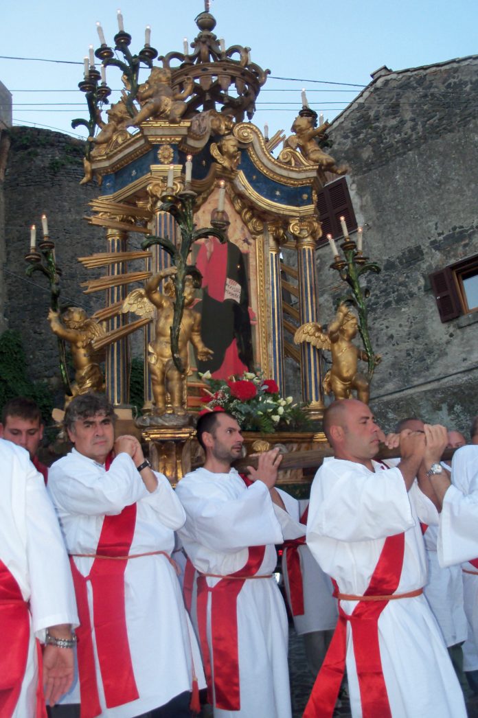 Il clou religioso è senz’altro la solenne processione alla presenza del vescovo della Diocesi di Civita Castellana Romano Rossi che si snoderà per le vie del paese. In spalla i parrocchiani vestiti di bianco e di rosso porteranno la macchina che raffigura parte del trittico trecentesco di Gregorio e Donato d’Arezzo.