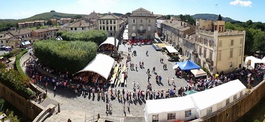 La sagra si svolge nella splendida piazza Umberto I, dove si affaccia Palazzo Altieri (già Palazzo Santa Croce), sul quale si legge quello che potrebbe essere definito l’atto di nascita del paese: “Giorgio Santa Croce quinto signore di Viano, figlio di Onofrio, disboscò la selva di Manziana, e condottovi i coloni nell’anno 1562, rese frequentata la strada Claudia, dotò di mura il castello di Oriolo, edificò la chiesa di S. Giorgio (1570), edificò questo palazzo”.