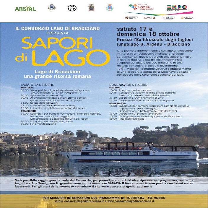 Il Consorzio Lago di Bracciano (ente pubblico formato al 70% dalla Città Metropolitana di Roma Capitale ed il restante 30% dai tre comuni di Anguillara Sabazia, Bracciano e Trevignano Romano) è lieto di invitarvi sabato 17 e domenica 18 ottobre all’evento SAPORI DI LAGO, organizzato grazie ad un contributo ricevuto dall’ARSIAL per la realizzazione di progetti di promozione agricola ed agroalimentare, connessi alle finalità dell’evento EXPO Milano 2015.