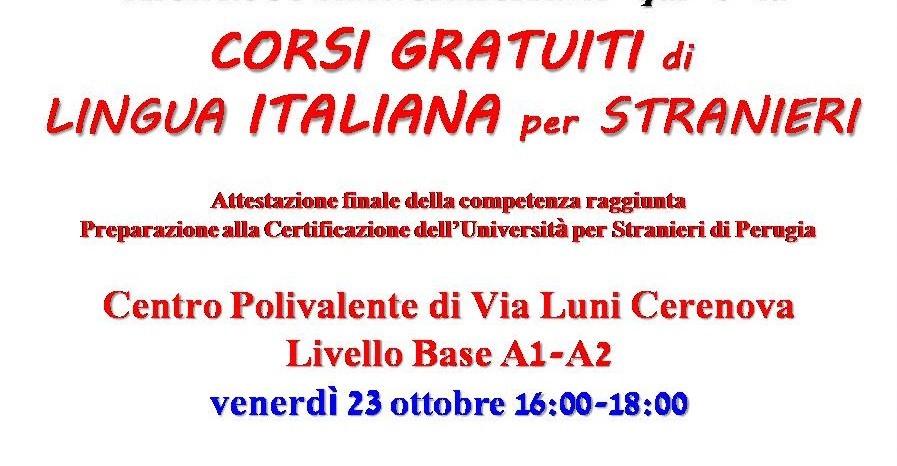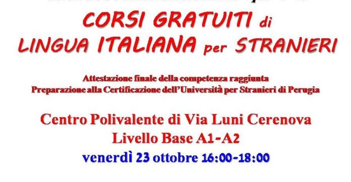 “Le iscrizioni sono aperte già da alcune settimane e abbiamo riscontrato già un buon numero di adesioni – ha dichiarato l’Assessora Francesca Cennerilli – questi corsi, che ricordo sono totalmente gratuiti e che grazie alla disponibilità di insegnanti volontari non graveranno nemmeno di un centesimo sulle casse comunali, rappresentano un ottimo strumento di formazione ed integrazione per tutti gli stranieri residenti nella nostra Città. Una serie di incontri legati alla cultura e alle tradizioni del nostro Paese, sulla società, sull’ordinamento giuridico e sulle normative italiane in merito ai servizi assistenziali. Invito la Cittadinanza a diffondere la notizia tra i nostri concittadini stranieri che desiderano apprendere meglio la nostra lingua”.