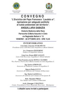 Un grande appuntamento quello di venerdì 30 Ottobre: il Lions Club presenta il Convegno “ L’Enciclica del Papa Francesco”Laudato si”.