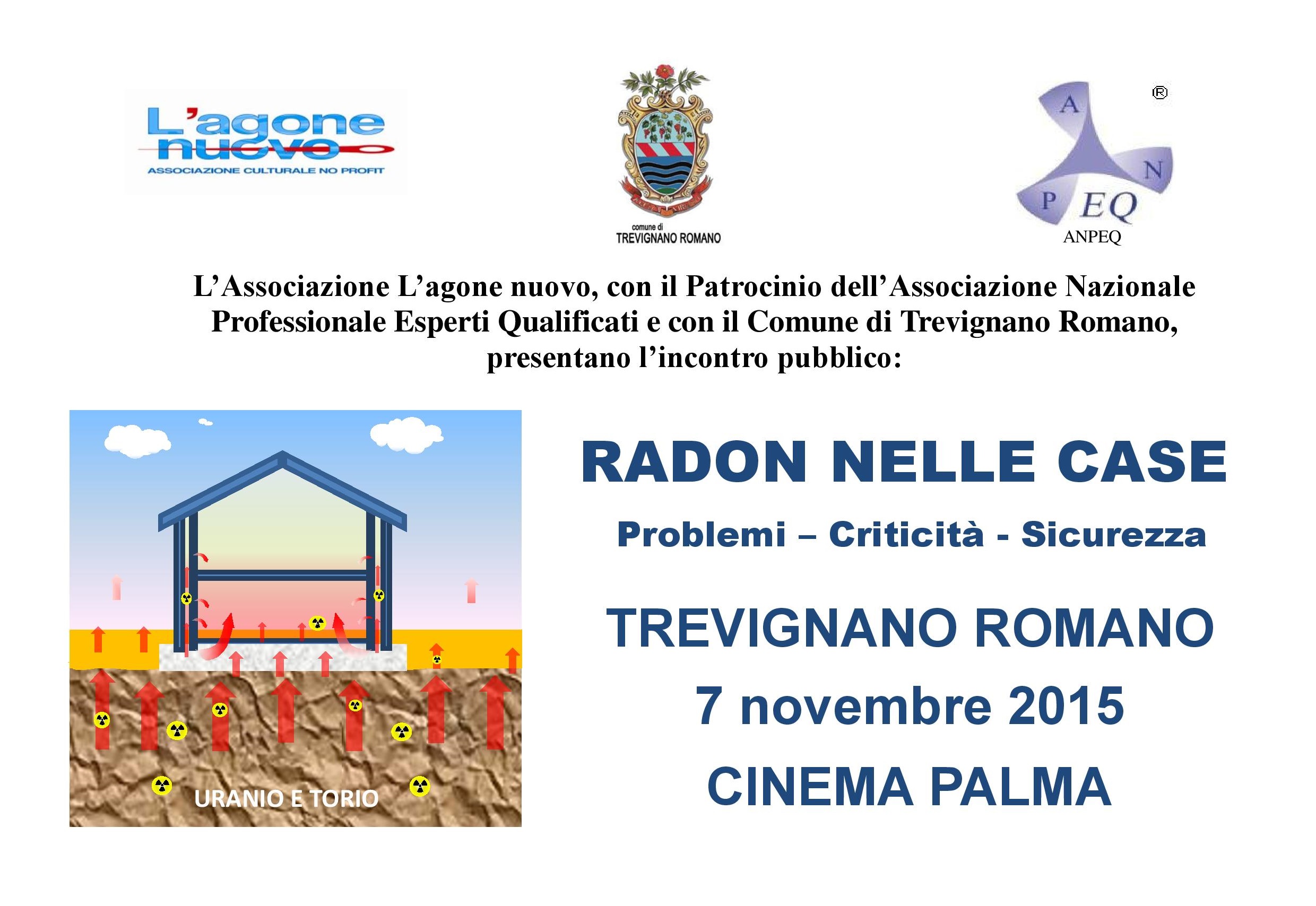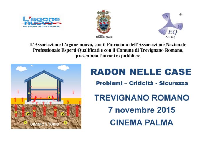 Sabato 7 novembre 2015 a Trevignano Romano alle ore 9,30, presso il Cinema Palma, l’Associazione L’agone nuovo, con il Patrocinio dell’Associazione Nazionale Professionale Esperti Qualificati e con il Comune di Trevignano Romano, presentano l’incontro pubblico “RADON NELLE CASE Problemi – Criticità – Sicurezza”.