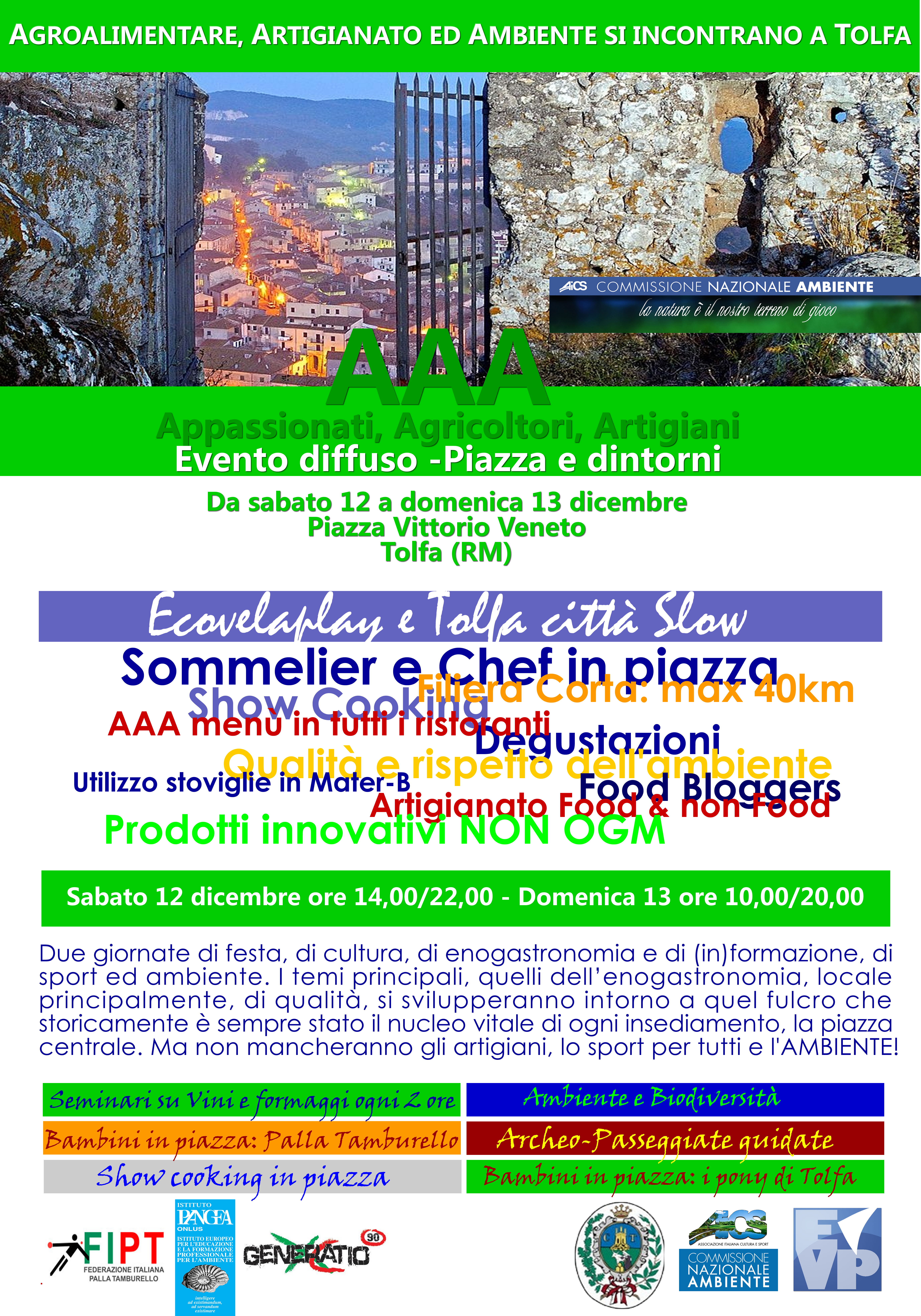 E’ questo il punto da cui sono partiti i responsabili della commissione nazionale ambiente di AICS progettando quello che è stato definito “evento diffuso” e che vedrà l’edizione numero zero in Tolfa il prossimo fine settimana (sabato 12 dicembre dalle 14 alle 22 e domenica 13 per l’intera giornata). L’evento diffuso prevede che nella piazza Vittorio Veneto, la piazza centrale di Tolfa, dove si impianterà il villaggio AICS, si svolga tutta la parte culturale e formativa, lasciando il consumo vero e proprio dei prodotti all’interno di una serie di cantine del centro storico che hanno aderito all’evento senza che però ciò abbia costi supplementari per gli utenti. Questo consentirà di dedicare la piazza a corsi di avvicinamento al vino previsti ogni 2 ore, stesso meccanismo per i formaggi e l’olio grazie alla presenza di Sommelier Fisar ed altri esperti.
