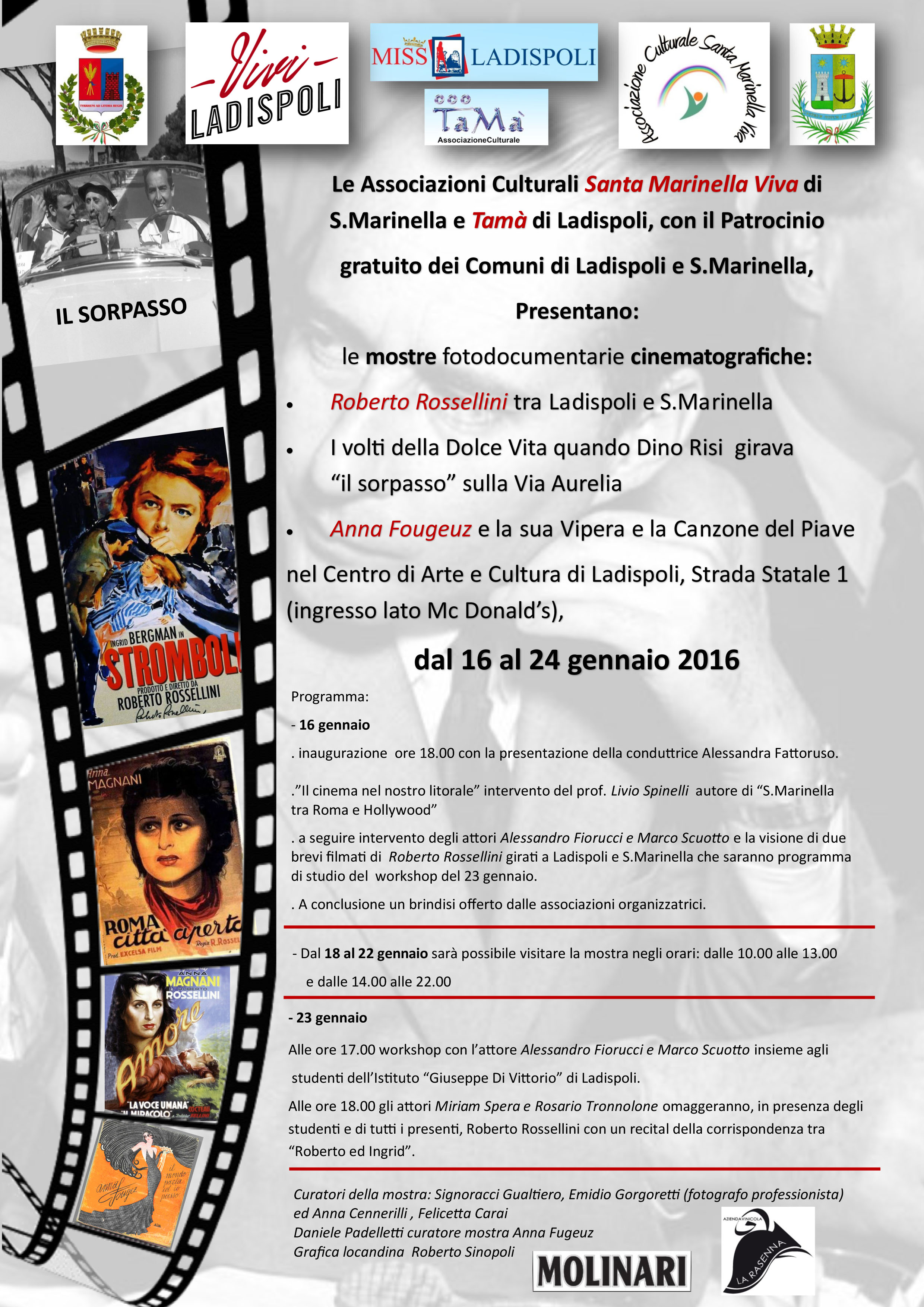 Le due associazioni, con il Patrocinio Gratuito dei Comuni di S.Marinella e Ladispoli organizzeranno dal 16 al 24 gennaio 2016 tre mostre fotodocumentarie cinematografiche, un seminario ed un recital per evidenziare il legame culturale delle due cittadine sulla storia del cinema nei locali del Centro di Arte e Cultura di Ladispoli/Auditorium, con l’auspicio di poter replicare l’evento anche a S.Marinella nei locali della nuova Biblioteca Comunale.