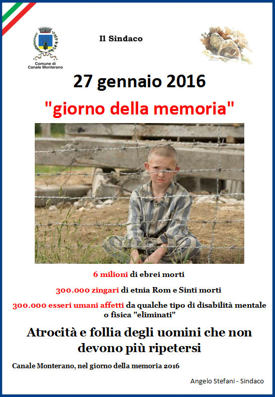 Nel giorno della memoria il Sindaco di Canale Monterano, Angelo Stefani, con un manifesto ha ricordato i tragici fatti dell’olocausto a 71 anni dall’ingresso nel campo di sterminio di Auschwitz dell’armata rossa. “Atrocità e follie degli uomini che – commenta Stefani – non devono più ripetersi”.