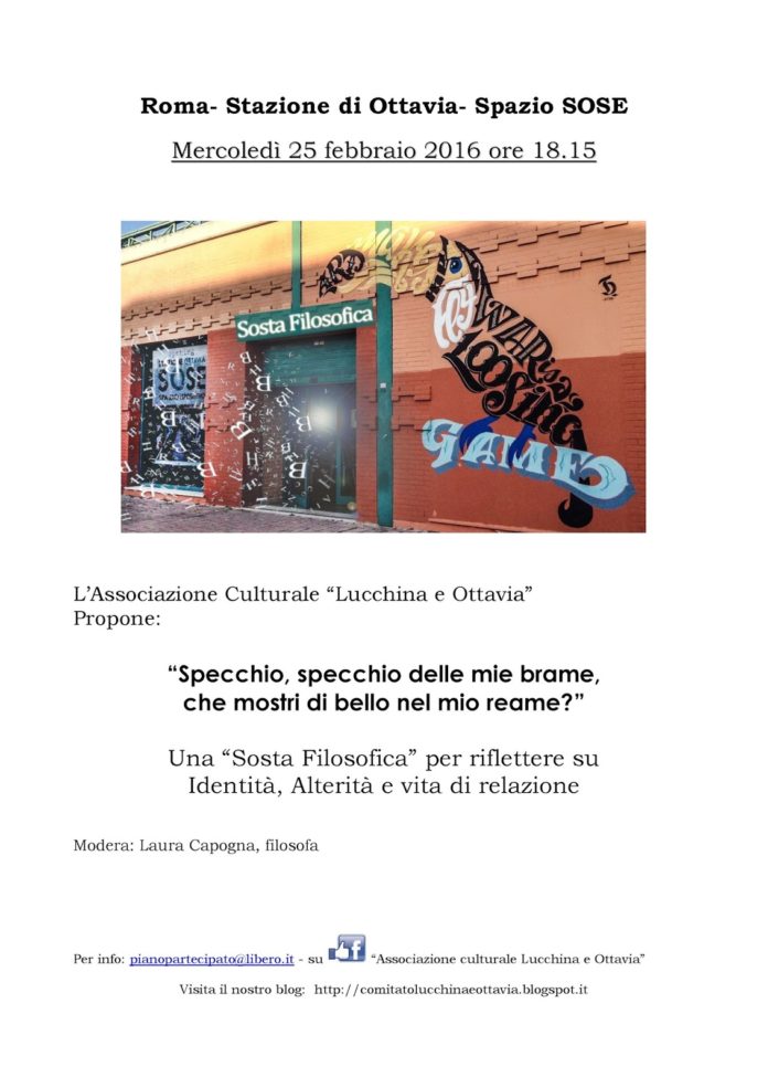 Proseguono gli incontri mensili della Sosta Filosofica presso la Stazione ferroviaria di Ottavia nei locali del SOSE. La prossima “Sosta” si terrà giovedì 25 febbraio con appuntamento alle ore 18.15 ed inizio puntuale alle ore 18.30, a moderare la filosofa Laura Capogna l’evento.