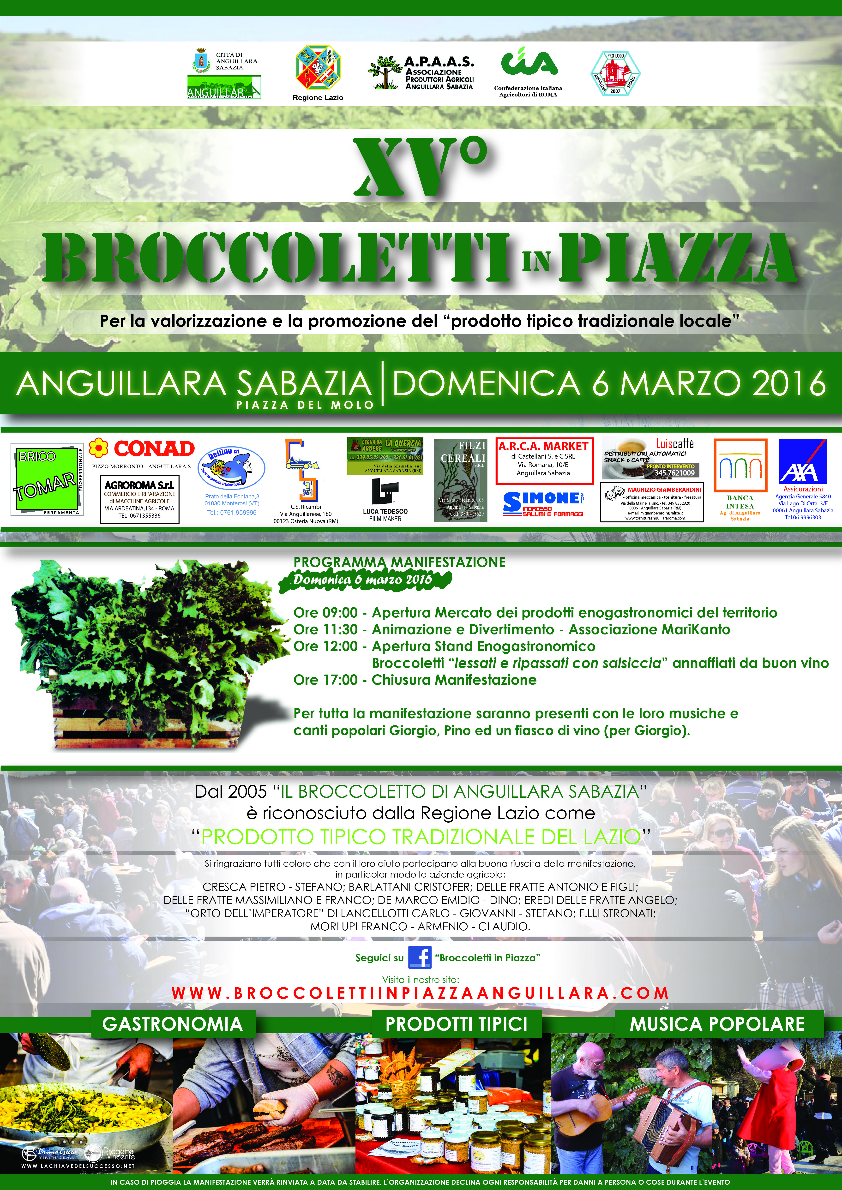 Nel 2015 si è raggiunto il picco delle 15.000 persone giunte in Piazza del Molo ad Anguillara Sabazia per degustare l’eccellente gastronomia a base di broccoletti. L’auspicio è quello di crescere ogni anno per valorizzare sempre più i prodotti locali del nostro territorio.