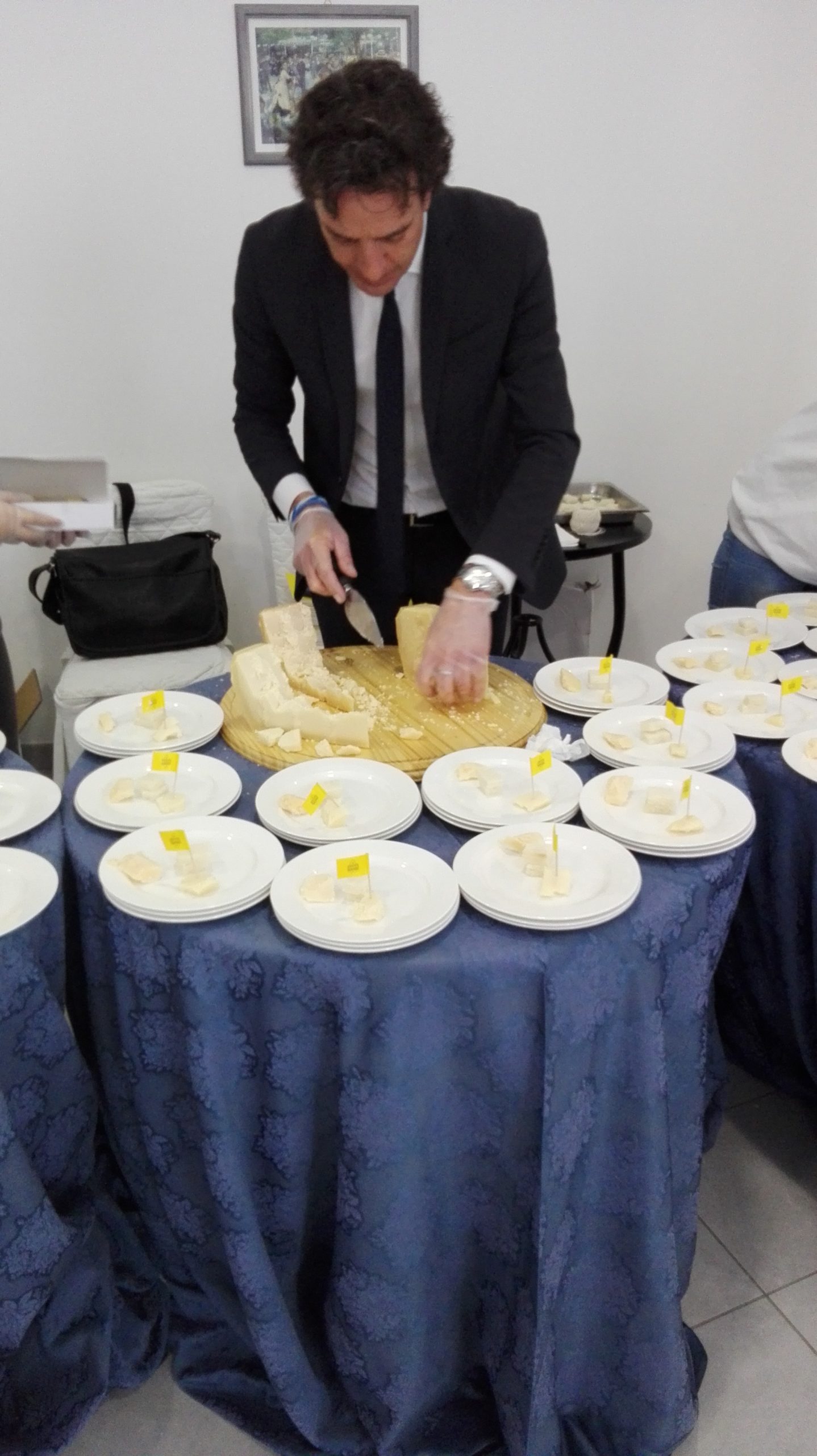 Paris, passando ad aspetti più tecnici, ha quindi ricordato le varie fasi del processo di produzione del “Grana Padano”: dalla lavorazione del latte in caldaie di rame, alla salatura, asciugatura e stagionatura (da un minimo di 9 ad oltre 20 mesi), per arrivare alla marchiatura finale. Nella seconda parte della giornata di studio, si è tenuta una ‘degustazione verticale guidata’: tre scaglie di Grana Padano di tre diverse stagionature (10, 22 e 36 mesi). Dall’analisi visiva a quella olfattiva, a quella meccanico-gustativa, Paolo Paris ha insegnato agli studenti come esercitare i sensi e lasciarsi emozionare dagli aromi e dai sapori, declinando il lessico affascinante del degustatore.