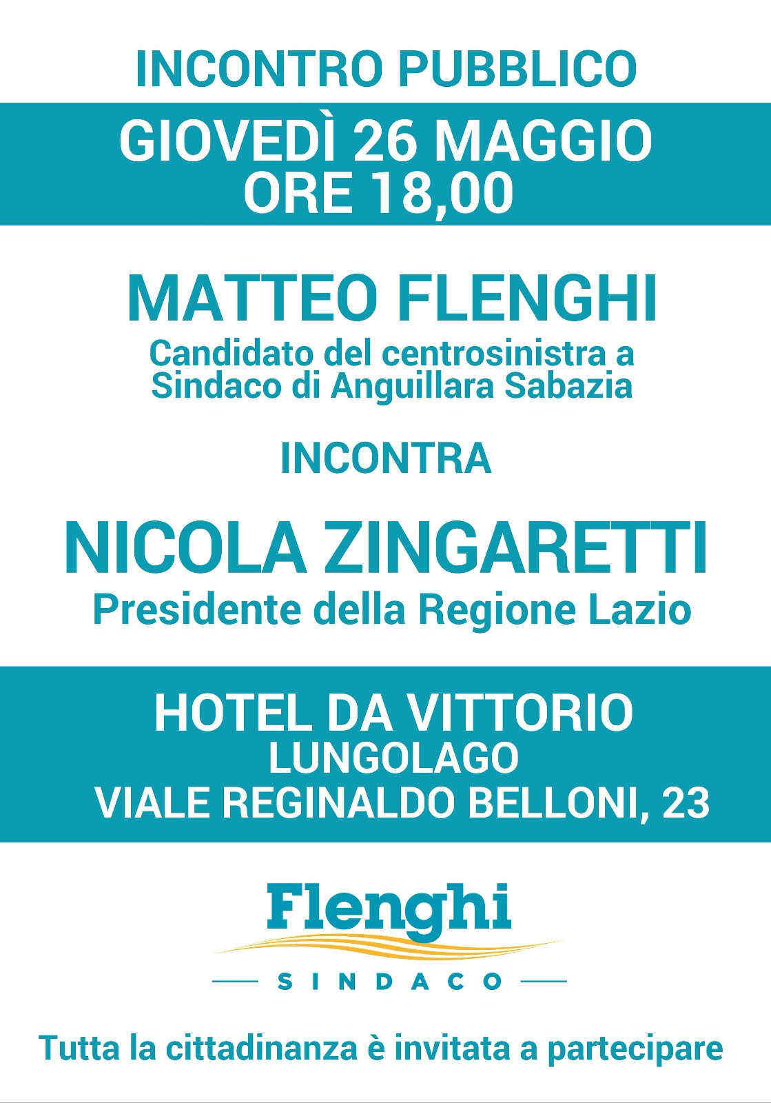 Si terrà questo pomeriggio l’incontro tra il candidato sindaco di centrosinistra di Anguillara Sabazia, Matteo Flenghi, ed il Presidente della Regione Lazio, Nicola Zingaretti.