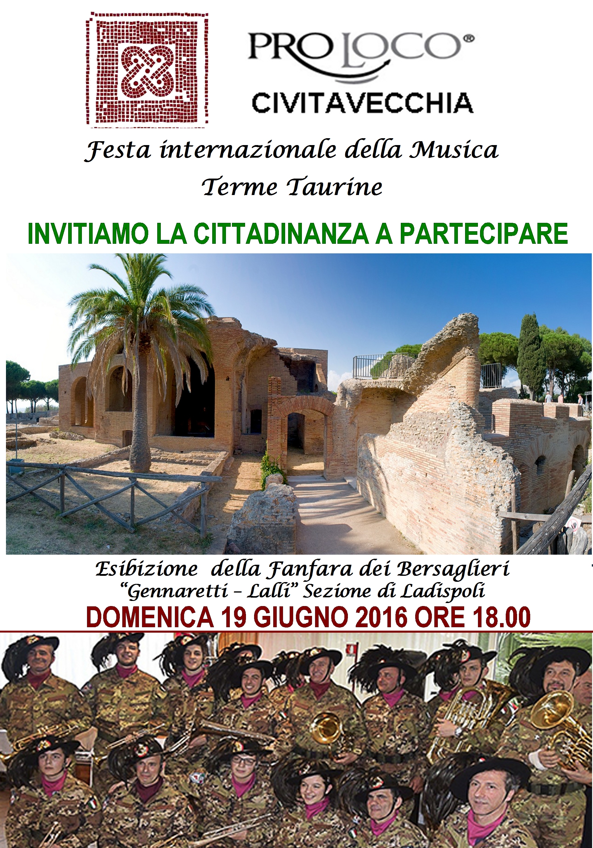 La musica come elemento di valorizzazione della cultura e del turismo. Con questo messaggio la Pro Loco cittadina ha voluto idealmente aderire alla Festa internazionale della musica, proponendo l’esibizione della Fanfara dei Bersaglieri Giovannetti – Lalli di Ladispoli.