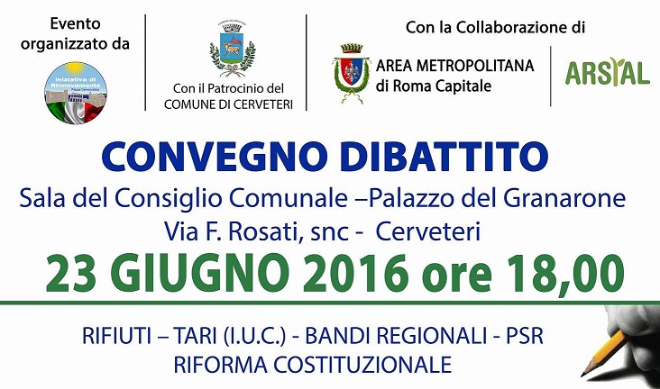 L’Associazione Piazza Democratica Iniziativa di Rinnovamento organizza il prossimo 23 giugno 2016 a Cerveteri presso la Sala del Consiglio Comunale presso il Palazzo del Granarone, il Convegno concernente gli argomenti relativi a tematiche di interesse pubblico quali Ambiente, TARI (I.U.C.), Agricoltura, Bandi Regionali e Riforma Costituzionale con riferimento alle soluzioni che la Regione Lazio sta attuando in questo momento di ripresa economica, attraverso i progetti e le possibilità offerte dai BANDI Europei e le politiche volte alla Formazione. L’intento dell’incontro è trovare soluzioni e aprire il dialogo su di esse coinvolgendo i cittadini, gli imprenditori, gli Enti e le Amministrazioni di concerto in merito a questioni di interesse collettivo.