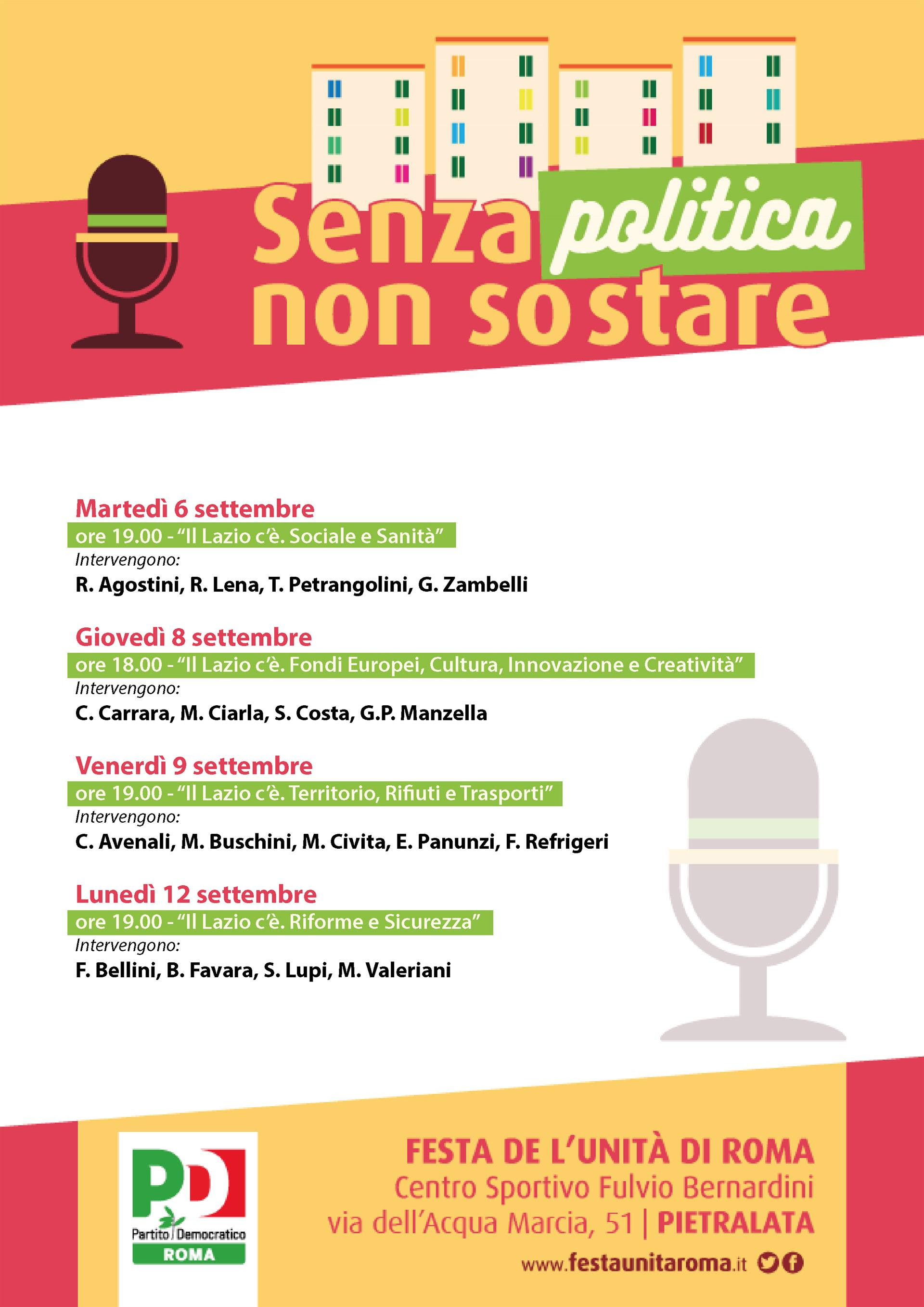 Riceviamo e pubblichiamo il calendario dibattiti della Festa dell’Unità di Roma, di scena in questi giorni al Centro Sportivo Fulvio Bernardini in via dell’Acqua Marcia, 51, a Pietralata.