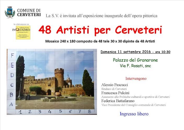 Alessio Pascucci, Sindaco di Cerveteri, invita la cittadinanza e il mondo della cultura allo svelamento dell’opera collettiva “48 artisti per Cerveteri” che avverrà domenica 11 settembre, alle ore 10.00, nel Palazzo del Granarone, sede della Biblioteca comunale e dell’Aula Consiliare.