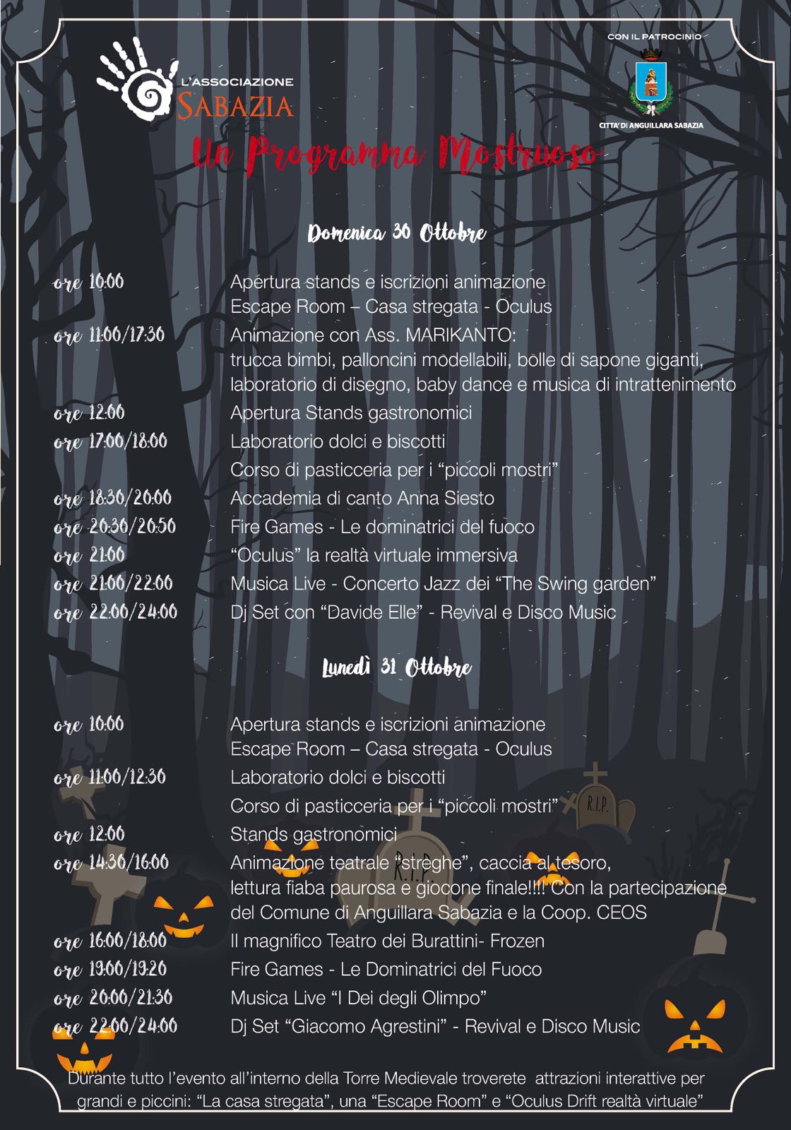 Il programma prevede nella domenica del 30 ottobre l’apertura degli stand e le iscrizioni all’ “Escape Room – Casa Stregata – Oculus” alle ore 10:00. Dalle 11:00 inizia l’animazione con l’Associazione “Marikanto” che si occuperà di truccare i bimbi presenti, creare giochi con i palloncini e con le bolle di sapone. Sarà aperto anche il laboratorio di disegno, una baby dance e tanta musica. Alle 12:00 apriranno gli stand gastronomici per pranzare tutti insieme. La giornata continuerà all’insegna delle golosità con l’apertura alle ore 17:00 del “Laboratorio di pasticceria per i piccoli mostri”. Dalle ore 18:30 il divertimento sarà a cura dell’ “Accademia di canto Anna Siesto” che intratterrà il pubblico con la le esibizioni delle allieve. La serata proseguirà con uno spettacolo delle “Dominatrici del Fuoco” ed un concerto jazz di musica Live dei “The Swing Garden”. Per concludere in bellezza dalle 22:00 Dj Set con Davide Elle (Revival e Disco Music).