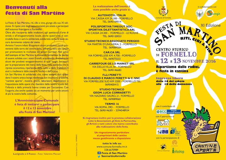 Γ finita lβattesa, inizia domani lβevento piΓΉ atteso dellβautunno veietano. L’amministrazioneΒ comunale di Formello, la Pro Loco e la cooperativa Sinergie vi attendono a braccia aperteΒ nellβantico borgo medievale per la XI edizione della Festa di San Martino: riti, cibi e vino.