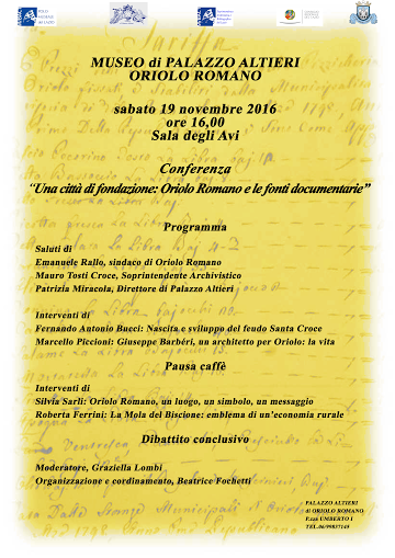 Sabato 19 novembre alle ore 16:00, presso la Sala degli Avi del Museo di Palazzo Altieri a Oriolo Romano, si terrà la conferenza dal titolo “Una città di fondazione: Oriolo Romano e e le fonti documentarie”.