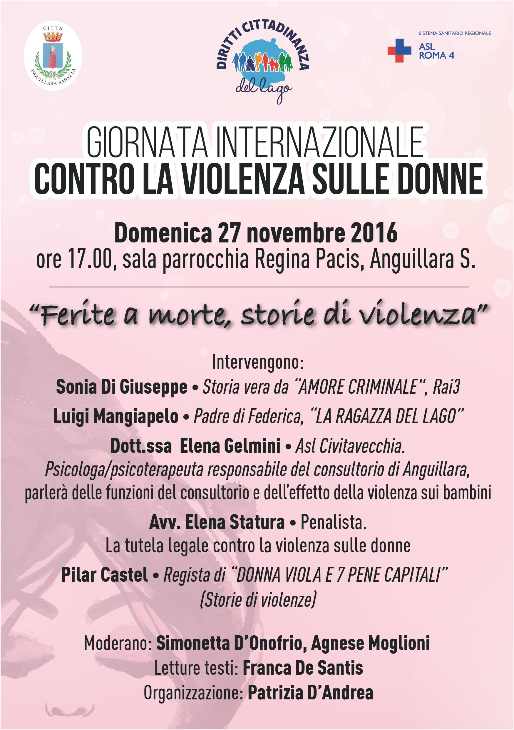 Alcuni brani del libro “Federica, la ragazza del Lago”, saranno letti dalla prof.ssa Franca De Santis. Prenderà in seguito la parola Sonia Di Giuseppe, che ci racconterà la sua storia accaduta in una zona periferica di Roma, Prima Porta, già trattata da “Amore Criminale”, trasmissione condotta da Barbara De Rossi, andata in onda su Rai TRE il giorno 27 aprile 2015.