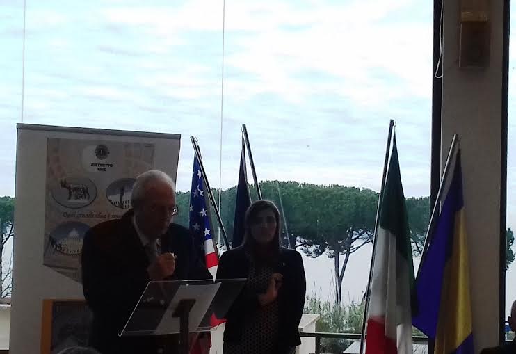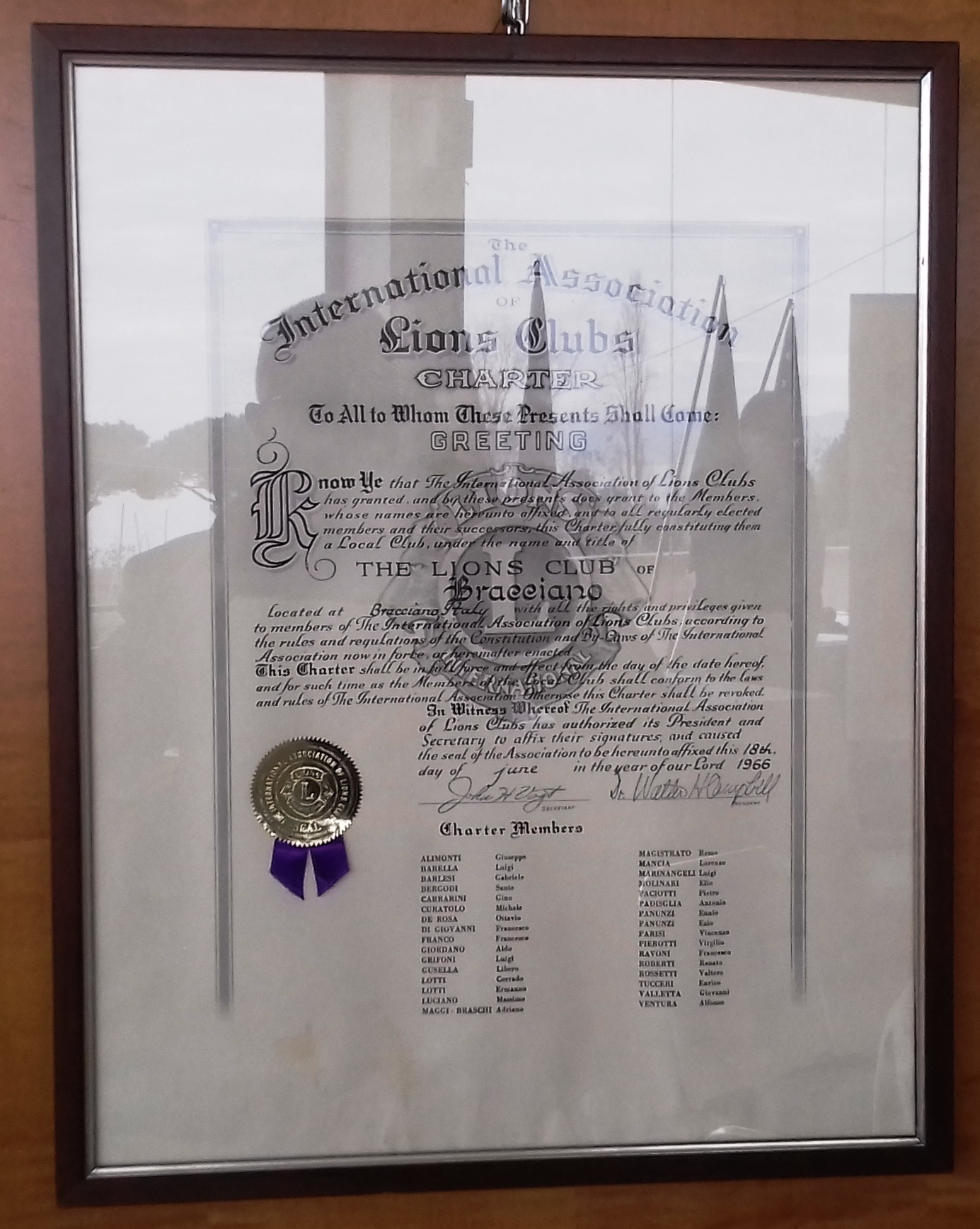 “Sullo stendardo del Club da oggi è collocata l’emblema recante la scritta “50 years”. La famosa Carta, la “Charter”, firmata 50 anni fa, con la stessa cornice e lo stesso vetro, è in questa occasione collocata nella parete davanti a voi, ben visibile. Reca i nomi di 32 Soci fondatori, di cui uno è ancora tra noi, qui presente: Alfonso Ventura.  Custode della Charter è il Socio più anziano, Antonio Gatto. Ciò premesso, illustrare 50 anni di storia del Club è impresa impossibile, specie in questo contesto. Ricordare – comunque – le radici di un Sodalizio peculiare come il Lions Club è un dovere non solo a beneficio dei Soci, ma anche per tutti i cittadini del territorio in cui opera il Club stesso. La vita presente di ciascuno di noi non è caratterizzata dalla attualità immediata, ma è permeata dal passato; e così anche il Club: esso è quello che è stato e che ha fatto, non solo in campo locale, ma anche in campo internazionale a beneficio di tutta l’umanità, insieme agli altri 45.000 Clubs sparsi in 210 stati nel mondo. Mi limiterò a brevissimi cenni storici. Nel lontano 1966 un gruppo di 32 cittadini di Bracciano e Comuni limitrofi, tra loro amici stretti, alcuni dei quali – i promotori –già Soci del Lions Club di Viterbo, decidevano di costituire un Lions Club in Bracciano, assumendo il Club di Viterbo come Club Sponsor. Il Nuovo Club riceveva ufficialmente la Charter –come sopra ricordato – il 10 dicembre successivo ed iniziava ad operare. Nel luglio del 2003 l’Assemblea dei Soci deliberava di chielionsdere agli Organi internazionali il cambio di denominazione in “Lions Club Bracciano Anguillara Sabazia Monti Sabatini”, meglio corrispondente a definire il territorio operativo, che comprende ora 6 Comuni e che per questo è molto impegnativo: Bracciano, Anguillara Sabazia, Trevignano Romano, Manziana, Canale Monterano, Oriolo Romano. In questo anno sociale (01 luglio 2016-30 giugno 2017) il Club, oltre ad operare con la stessa efficacia nel suo territorio, è stato e sarà impegnato a realizzare il PIANO DEL CENTENARIO dell’Associazione internazionale che prevede mirati interventi nei settori: I GIOVANI, LA VISTA, LA FAME, L’AMBIENTE. Rivolgo ora un appello alle Autorità presenti – e lo farò con altri mezzi alle altre – di ogni tipologia – perchè aprano con fiducia le porte ai Lions. Ringrazio quelle Amministrazioni che ci hanno consentito e ci consentiranno di presentare la nostra storia e le nostra attività nei Consigli comunali.”