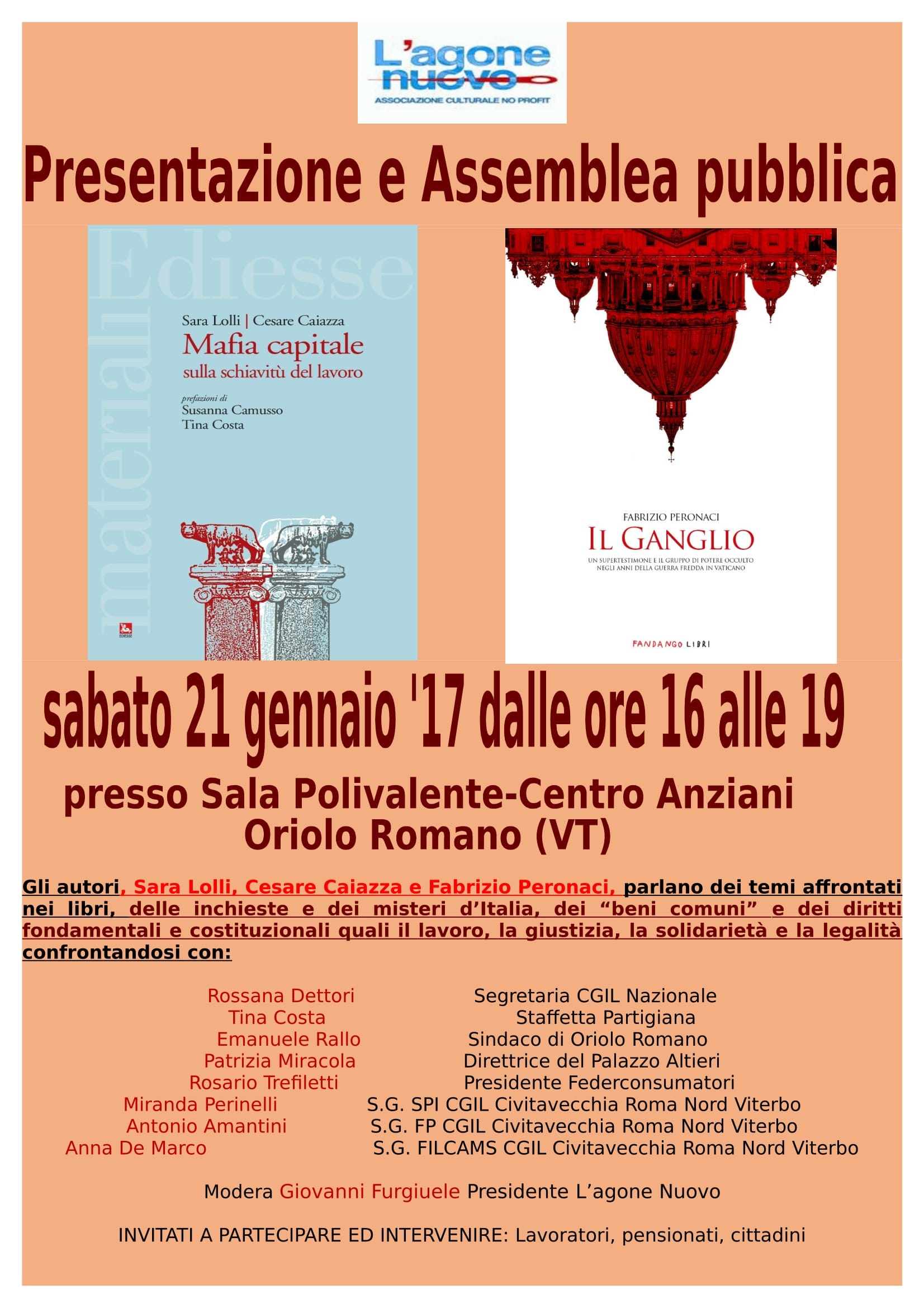 Sabato 21 gennaio, dalle ore 16:00 alle ore 19:00, presso la Sala Polivalente del Centro Anziani di Oriolo Romano, l’Associazione Culturale L’Agone Nuovo organizza un pomeriggio all’insegna della cultura, con la presentazione di due libri: “Mafia Capitale sulla schiavitù del lavoro” di Sara Lolli e Cesare Caiazza, e “Il Ganglio” di Fabrizio Peronaci.