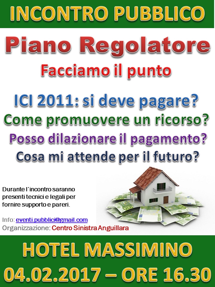Sabato 4 febbraio, alle ore 16:30, presso l’Hotel “Massimino” di Anguillara Sabazia, si terrà l’incontro pubblico organizzato dal Centro Sinistra e incentrato sulla variante al Piano Regolatore di Anguillara.