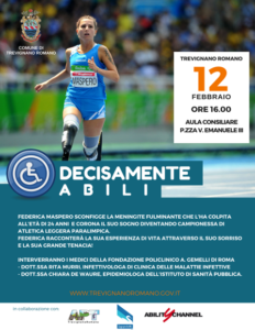 Ospite dell’incontro la campionessa paralimpica di atletica leggera Federica Maspero, colpita da meningite fulminante all’età di 24 anni, biamputata, ma che, nonostante la sua grave disabilità, si è rialzata più forte di prima, diventando medico e coronando il suo sogno di atleta.