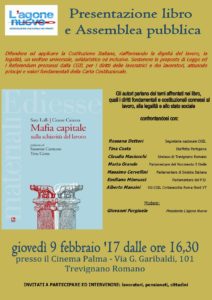 Oggi pomeriggio, dalle ore 16:30 alle 19:00, presso il Cinema Palma di Trevignano Romano, l’Associazione culturale L’Agone Nuovo organizza la presentazione del libro di Sara Lolli e Cesare Caiazza “Mafia Capitale sulla schiavitù del lavoro” e l’Assemblea Pubblica sui temi affrontati nel volume: la legalità, la dignità del lavoro e i diritti delle persone fragili e in difficoltà.