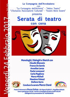 La Compagnia dell’Arcobaleno ha organizzato una Serata di Teatro con cena presso il ristorante La Mucca Golosa di Anguillara. Lo spettacolo che si svolgeva mentre veniva servita la cena era formato da monologhi, dialoghi e sketch come recita la locandina.